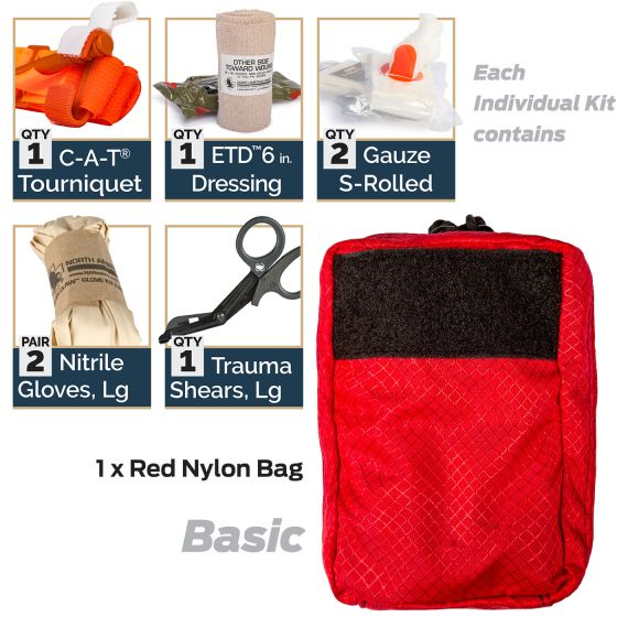 Packaged in a durable nylon carry bag, these kits include practical, user-friendly components proven to support lifesaving intervention. Typical contents include a highly effective prehospital tourniquet known for its reliability and rapid application, along with quality gauze, trauma shears, and pressure bandages to help manage serious wounds.